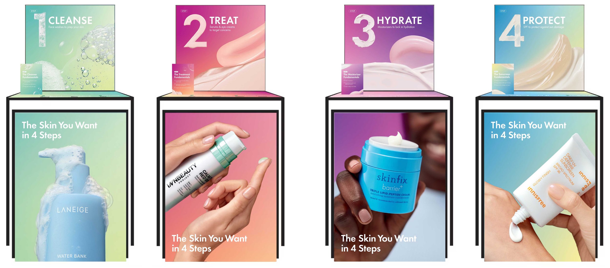 Grounded in research showing that clients often feel overwhelmed by the abundance of skincare options, the creative team developed an inviting visual system and simplified message that empowered clients to start and sustain a routine with confidence.