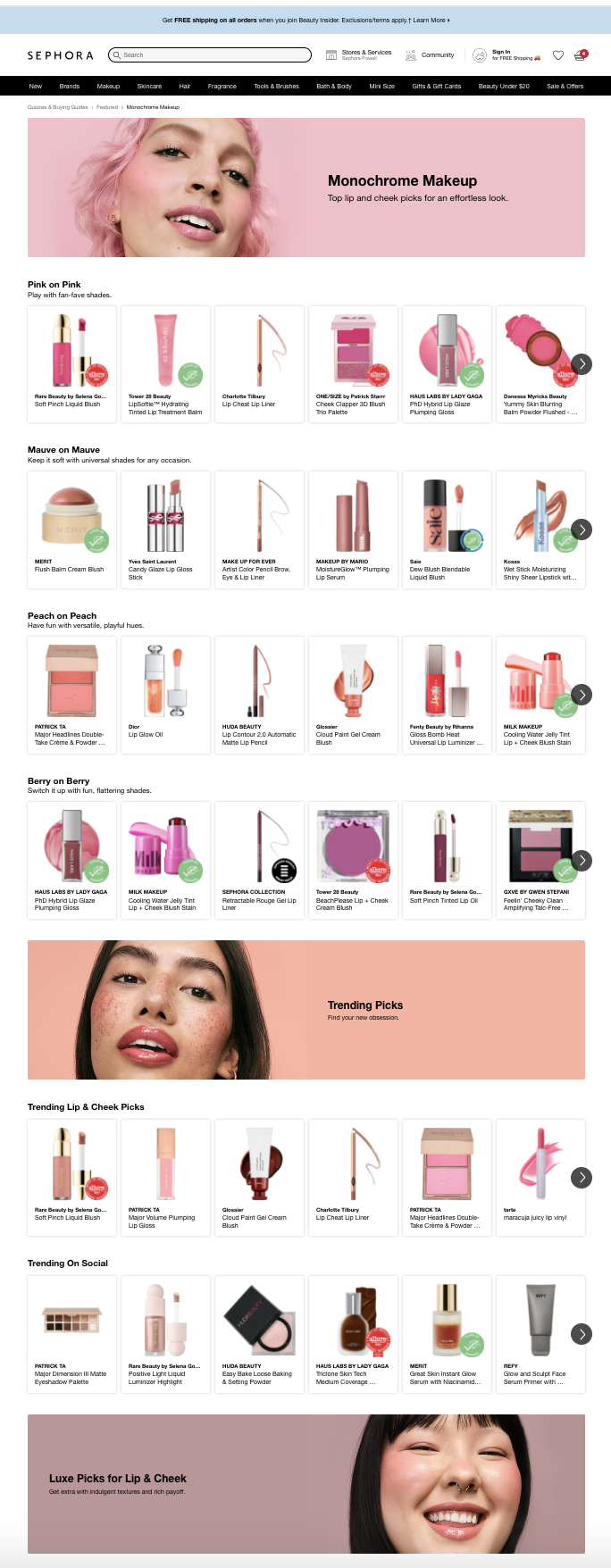 Launched in February 2024, the Monochromatic Makeup Story campaign explored the impact of single-shade styling by pairing lip and cheek products in matching hues. Featuring color stories in pink, mauve, peach, and berry-toned purple, the campaign invited clients to discover cohesive, expressive looks built around one statement shade.