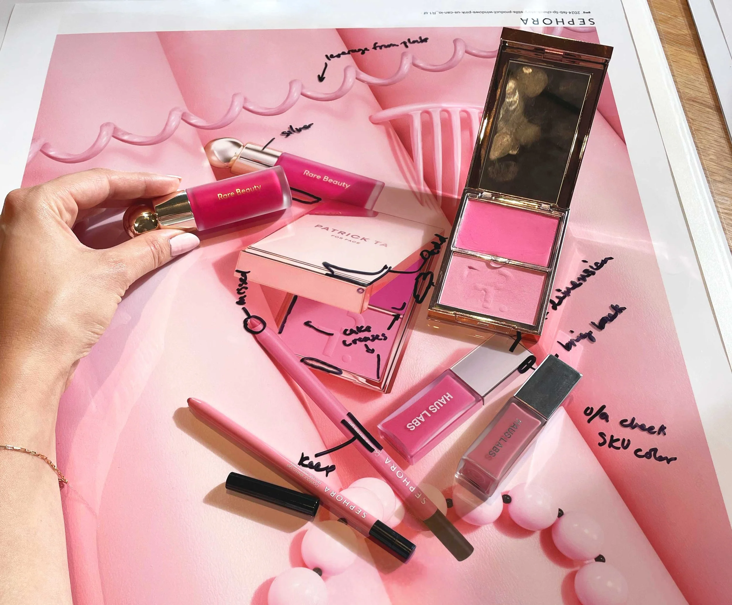 It was essential to build environments that felt intentional and cohesive. To achieve this, every prop, backdrop, and styling element was carefully selected to harmonize with the makeup shades featured in each scene. This approach not only unified the imagery but also introduced dimension and depth.
